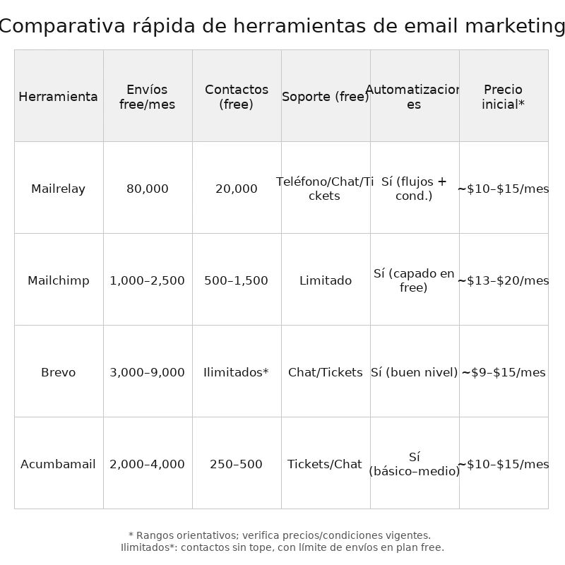 Si tu intención es crecer con un plan gratuito generoso, automatizar desde el día uno y contar con soporte real cuando lo necesites, Mailrelay es, para la mayoría de emprendedores, la mejor relación valor/facilidad/escalabilidad. Mailchimp, Brevo y Acumbamail son excelentes opciones, pero Mailrelay te da más aire para despegar sin sorpresas.